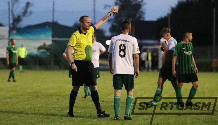 Nach etwas mehr als einer halben Stunde fiel dem unparteiischen Linienrichter dann eine Aktion ins Auge, die sonst wohl untergegangen wäre: Mohamad Sulayman wurde von seinem Gegenspieler permanent mit dem Ellenbogen bearbeitet, ohne dass der Ball überhaupt in der Nähe war. Dafür gab es dann den Roten Karton (35.). Die Wilhelmshavener fühlten sich nun zunehmend benachteiligt und lamentierten bei jeder Kleinigkeit.