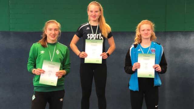 Vorher hatte die 15-Jährige schon zwei Hürdenläufe und den Weitsprung absolviert. Bein den 60m Hürden lief es im Vorlauf noch ganz gut, aber im Finale fehlte der Rhythmus bereits an der zweiten Hürde. Somit erlief Jule nur Rang 4. Beim Weitsprung lieferte die Nordenhamerin. Im letzten Versuch sprang Jule genau 5,00m und gewann damit den Wettbewerb. Im 60m Finale lief Jule in 7,9 sec. auch auf Platz 1.