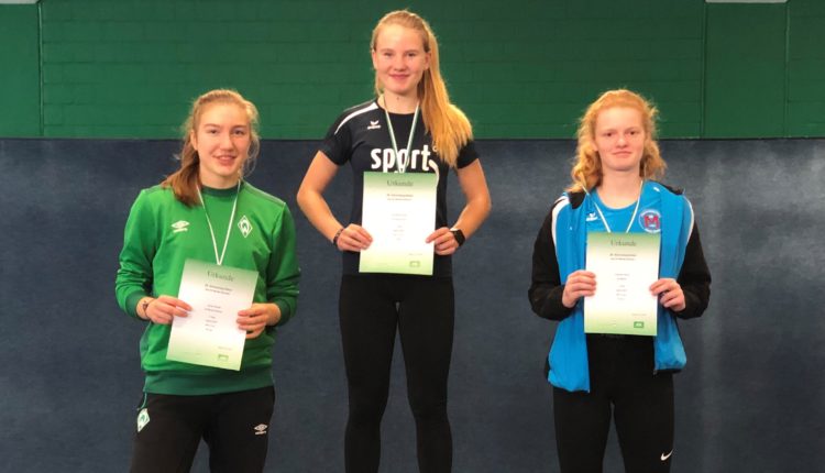 Vorher hatte die 15-Jährige schon zwei Hürdenläufe und den Weitsprung absolviert. Bein den 60m Hürden lief es im Vorlauf noch ganz gut, aber im Finale fehlte der Rhythmus bereits an der zweiten Hürde. Somit erlief Jule nur Rang 4. Beim Weitsprung lieferte die Nordenhamerin. Im letzten Versuch sprang Jule genau 5,00m und gewann damit den Wettbewerb. Im 60m Finale lief Jule in 7,9 sec. auch auf Platz 1.
