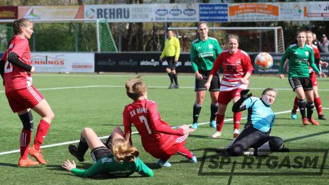 Die Gäste hatten zwar den besseren Start, konnten sich aber nicht entscheidend durchsetzen. Das gelang auf der Gegenseite Sarah Helmts, die ihr Team mit der ersten Chance in Führung brachte (9.). Lange durften sich die Gastgeberinnen darüber aber nicht freuen. Nach einem Eckstoß nutzte Mareen Klever das unentschlossene Abwehrverhalten der SVB-Hintermannschaft und glich per Kopf aus.