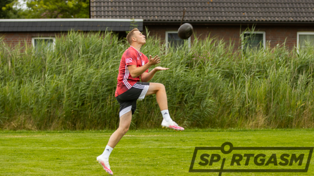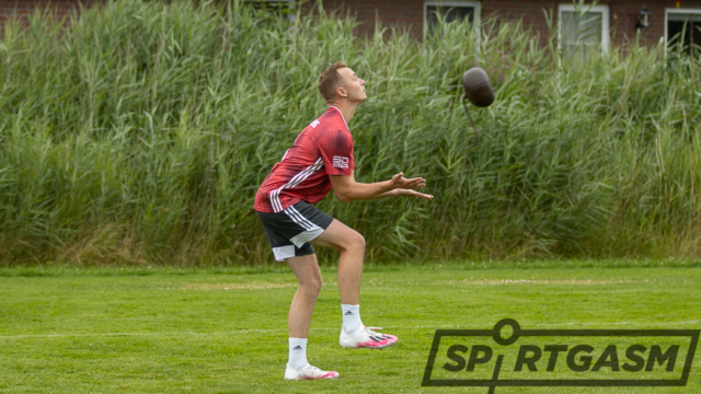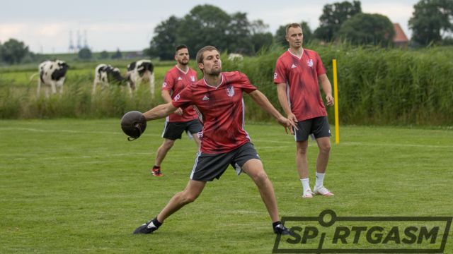 Durch eine Bearbeitung des Spielballes erhofften sich die Waddenser, eine größere Weite zu erzielen. Das frisch aufgetragene Melkfett sorgte jedoch für keinen guten Spielfluss. Viele Bälle glitten beim Fangen einfach durch die Arme und fielen auf den Boden. Gehörte diese einschmieren schon zu den letzten Tricks von A. Riesebieter, um endlich die ersten Punkte der Saison einzufahren?! Nachdem die ersten, mit Fehlern gespickten, Minuten vergangen waren, konnten die Waddenser eine Schippe drauf legen und drängten die Gäste weit in deren Gefahrenbereich hinein. Folgerichtig erzielten sie aufgrund ihrer kompakt stehenden Mannschaft auch das erste Tor des Abends.