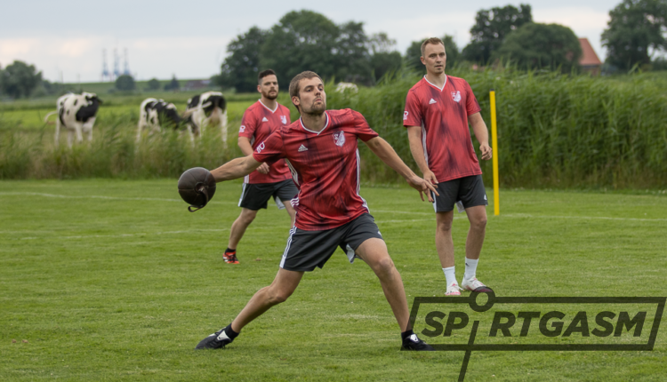 Durch eine Bearbeitung des Spielballes erhofften sich die Waddenser, eine größere Weite zu erzielen. Das frisch aufgetragene Melkfett sorgte jedoch für keinen guten Spielfluss. Viele Bälle glitten beim Fangen einfach durch die Arme und fielen auf den Boden. Gehörte diese einschmieren schon zu den letzten Tricks von A. Riesebieter, um endlich die ersten Punkte der Saison einzufahren?! Nachdem die ersten, mit Fehlern gespickten, Minuten vergangen waren, konnten die Waddenser eine Schippe drauf legen und drängten die Gäste weit in deren Gefahrenbereich hinein. Folgerichtig erzielten sie aufgrund ihrer kompakt stehenden Mannschaft auch das erste Tor des Abends.